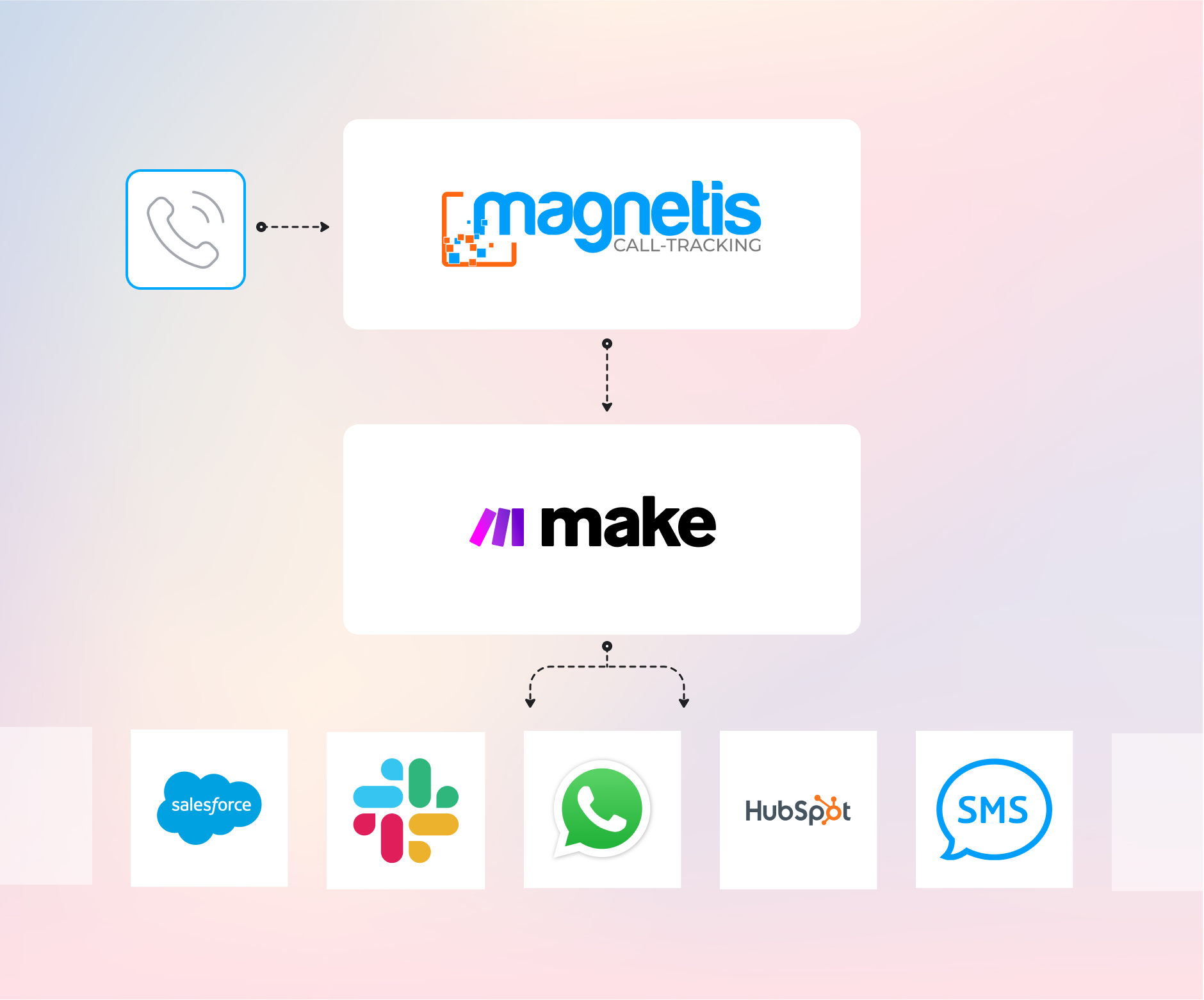 Dans la gestion quotidienne de votre réseau de points de vente ou de votre agence, la saisie manuelle des données d'appels est une perte de temps considérable. En associant Make à Magnétis, la solution de call-tracking N°1 pour les réseaux, vous connectez instantanément vos numéros trackés à l'ensemble de votre écosystème digital. Magnétis s’intègre avec vos outils de marketing automation, CRM et plateformes publicitaires grâce aux connecteurs, vous libérant ainsi de toute contrainte technique.